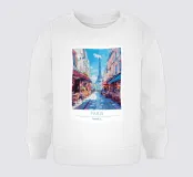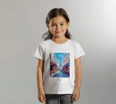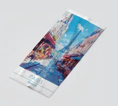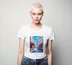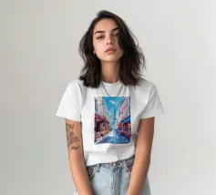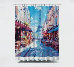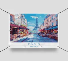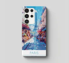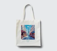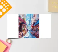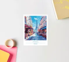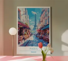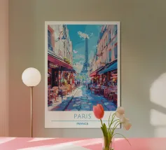 Vivete il romanticismo della Ville Lumière con questo affascinante poster di Parigi. L'opera raffigura una strada secondaria parigina per eccellenza, fiancheggiata da accoglienti caffè e bistrot con sedie in rattan e tende da sole colorate. La strada acciottolata conduce lo sguardo direttamente all'iconica Torre Eiffel, drammaticamente incorniciata tra gli edifici storici di Haussmannian. Il dipinto utilizza una tavolozza di colori vibranti e impressionistici con blu, rosa e viola intensi che riflettono l'eccellente atmosfera di una giornata di sole in città. Questo poster digitale di alta qualità (7000x5000 pixel, 300 dpi) è un perfetto pezzo di