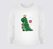 Un allegro dinosauro verde è decorato in modo spiritoso per assomigliare a un albero di Natale, con tanto di luci colorate e stella sulla testa. Le parole "Tree Rex" sono scritte in modo scherzoso accanto ad esso, per rendere ancora più festoso il tema.