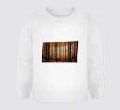 Il dipinto digitale di una foresta autunnale presenta sagome scure di alberi su uno sfondo caldo e dorato. L'opera d'arte testurizzata mostra un fogliame dettagliato nei toni dell'arancione e del marrone, creando una scena di bosco serena e suggestiva.
