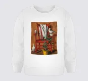 Una sedia con un panno bianco e una pianta è circondata da uccelli bianchi. Lo sfondo è marrone.