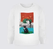 Un'affascinante raffigurazione di un gatto bianco e nero, probabilmente un gatto Tuxedo, seduto serenamente su un muro o un gradino di pietra danneggiato dalle intemperie. Il morbido fogliame verde e i delicati fiori rossi fanno da sfondo alla natura.