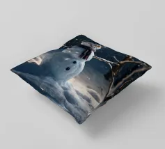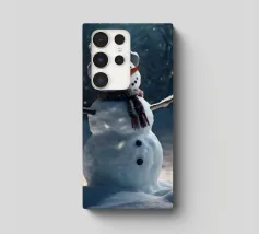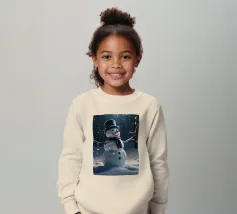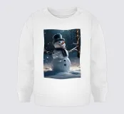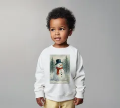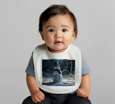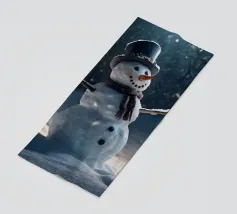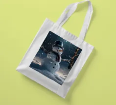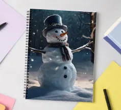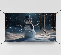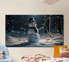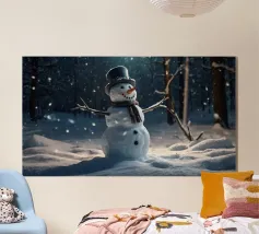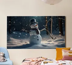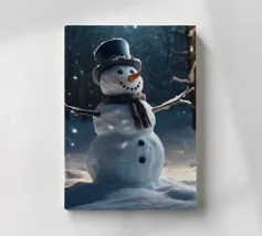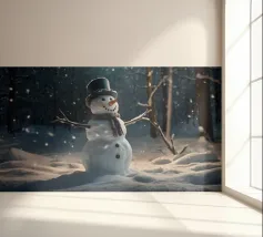 Un pupazzo di neve, con tanto di cappello a cilindro e sciarpa, saluta la sera d'inverno in una foresta serena. I fiocchi di neve cadono delicatamente intorno, creando un'atmosfera magica.