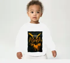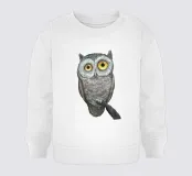 Un dipinto a olio di un gufo dall'aspetto simpatico e divertente. Si tratta di un uccello marrone chiaro con grandi occhi arancioni. Gli occhi del gufo sono un po' irregolari, il che lo fa sembrare ancora più buffo e dolce. Sembra anche un po' spaventato con i suoi occhi rotondi.