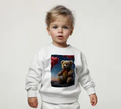 Un simpatico orsacchiotto vestito con un'accogliente felpa con cappuccio siede nella neve, tenendo gioiosamente un cuore rosso mentre un palloncino si muove nell'aria fresca della sera sotto un tramonto colorato.