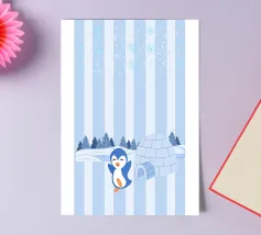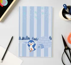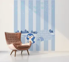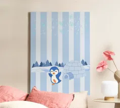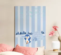 Poster Igloo Pinguino Felice! Un allegro e simpatico pinguino è raffigurato all'esterno di un igloo di neve sotto una pioggia di bellissimi fiocchi di neve e stelle. Questa adorabile illustrazione è perfetta per creare un'atmosfera calma e invernale in una cameretta o nella stanza del bambino. I toni tenui del blu e del bianco evocano un bellissimo paesaggio polare. Una dolce opera d'arte da parete per gli amanti dei pinguini, della neve e dei simpatici animali! Pinguino, carino, igloo, neve, fiocco di neve, stelle, inverno, polare, artico, cameretta, camera dei bambini, decorazione da parete, illustrazione, allegro, blu, animale.