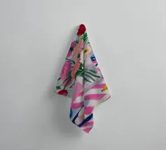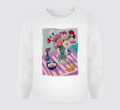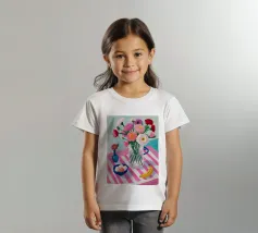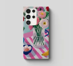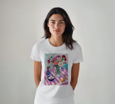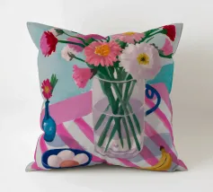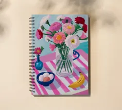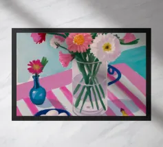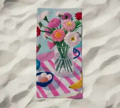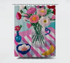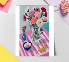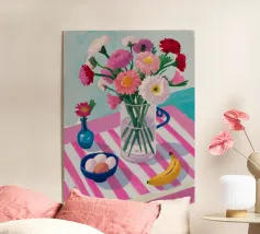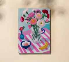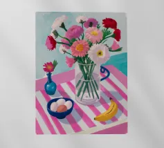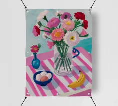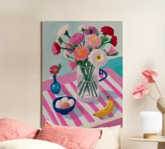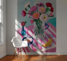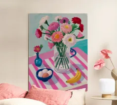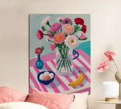 Un'affascinante natura morta di un tavolo da colazione con un vaso di fiori rosa, una ciotola di gelato e una banana. Il vaso a righe e l'ambientazione colorata creano una scena dolce, allegra e leggermente stravagante.
