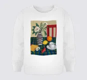 Elegante composizione di natura morta con fiori bianchi in un vaso a righe bianche e nere. Una sedia rossa, una tazza di caffè e un'arancia completano la scena, creando un momento equilibrato e tranquillo di vita quotidiana.