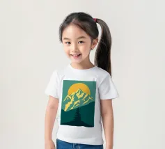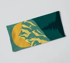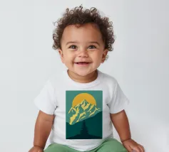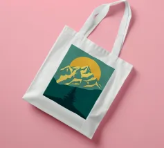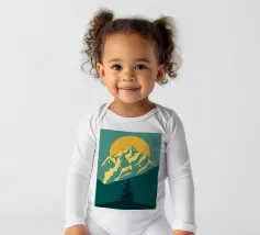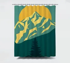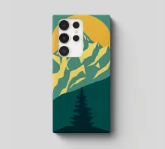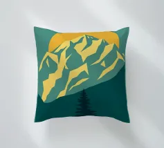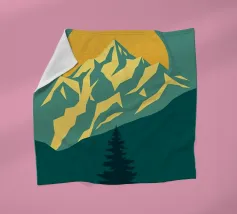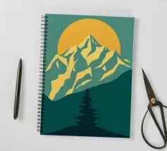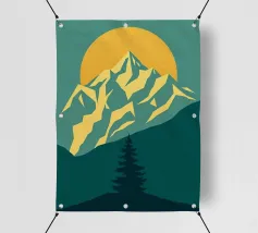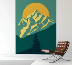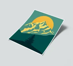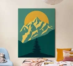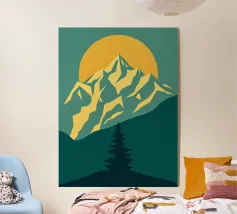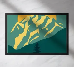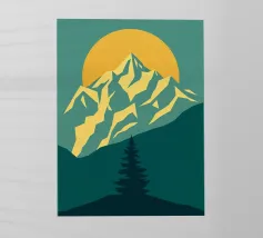Questa suggestiva stampa d'arte cattura la serena maestosità di un paesaggio montano con un tocco moderno e geometrico. Un sole dorato e brillante sorge dietro una catena montuosa affilata e sfaccettata, proiettando un bagliore caldo e luminoso. Il primo piano è caratterizzato da colline stratificate nei toni del verde e del blu, con un albero sempreverde solitario che si staglia contro le cime vibranti. Le linee pulite e stilizzate e i colori ricchi e contrastanti rendono questo pezzo un perfetto connubio tra natura e design contemporaneo. È un complemento ideale per chiunque voglia dare un tocco di bellezza minimalista e di colore deciso alla propria casa, ufficio o studio.