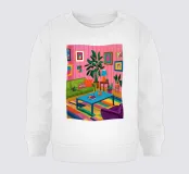 Un'illustrazione vivace di un soggiorno eclettico e massimalista con mobili colorati, una parete a galleria, numerose piante d'appartamento e un tappeto viola.