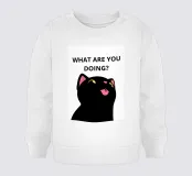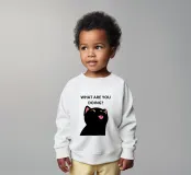 Un gatto nero con occhi gialli e orecchie rosa guarda in alto con un'espressione curiosa. Sopra il gatto "COSA STAI FACENDO?".