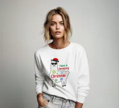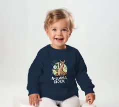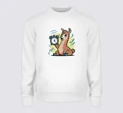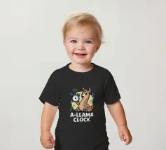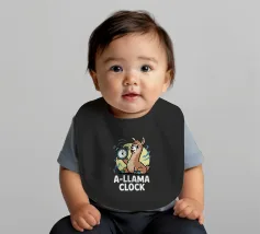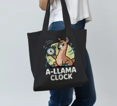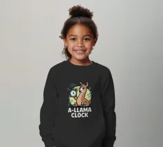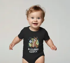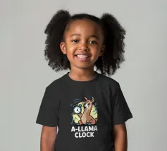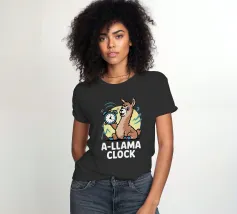 Un allegro lama regge una sveglia, circondato da elementi giocosi e cartooneschi che suggeriscono il movimento. Sotto l'immagine, la frase umoristica "A-llama Clock" aggiunge un tocco divertente.