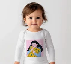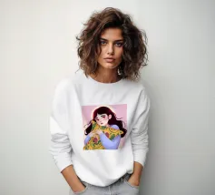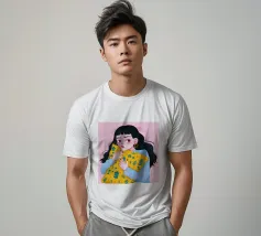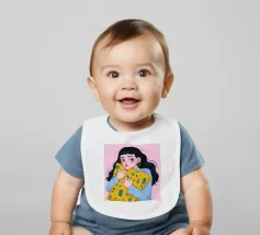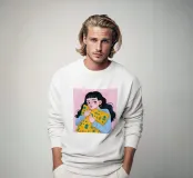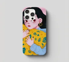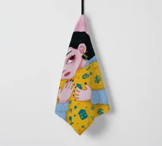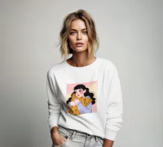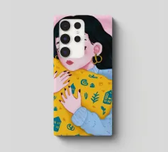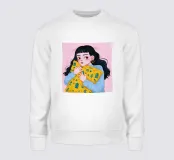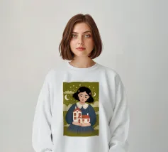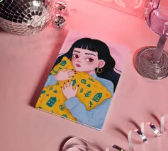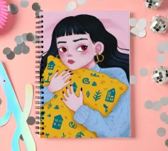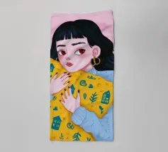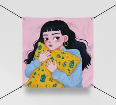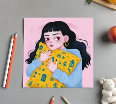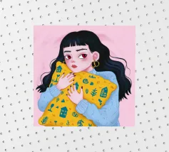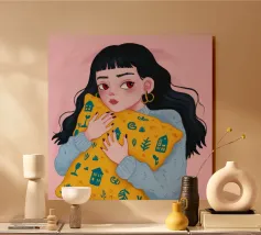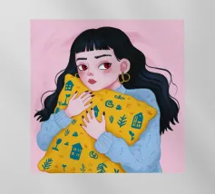 Questa opera d'arte raffigura una persona con i capelli scuri, che indossa un maglione blu e abbraccia un cuscino giallo con motivi di case. Lo sfondo è rosa, a sottolineare il tema accogliente e confortante.