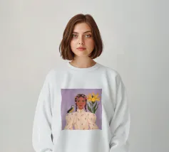 Il dipinto mostra una persona che tiene in mano un bouquet di grandi fiori rosa. Lo sfondo è pieno di altri elementi floreali, che sottolineano la bellezza e l'abbraccio della natura.