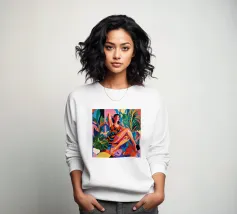 Questa opera d'arte raffigura due persone sdraiate insieme su uno sfondo colorato e tropicale. I colori vivaci e la posa intima trasmettono un senso di calore e connessione.