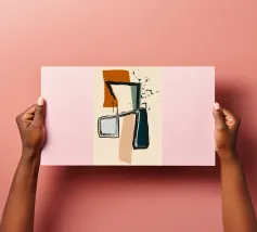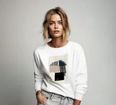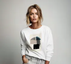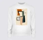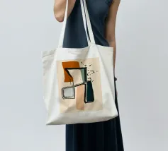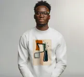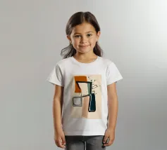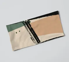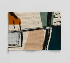 Forme astratte e pennellate decise nei toni della terra si combinano con uno sfondo chiaro. La composizione presenta rettangoli sovrapposti e schizzi a forma libera, creando un look dinamico e moderno.