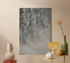 Masse d'acqua della cascata Dettifoss in Islanda. Fotografia astratta in bianco e nero di gocce d'acqua in caduta e vortici d'acqua, ideale per chi ama la destinazione turistica scandinava dell'Islanda.