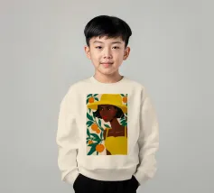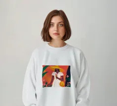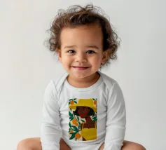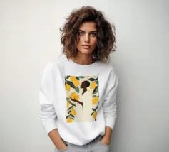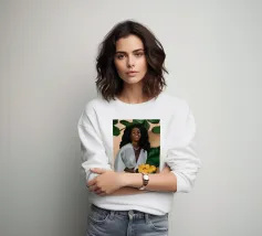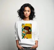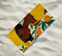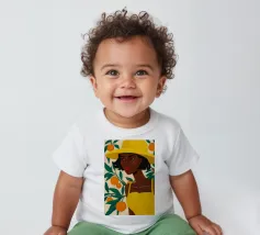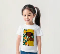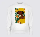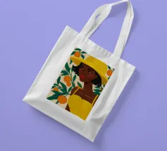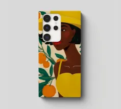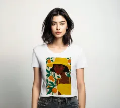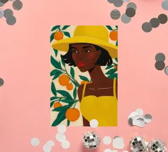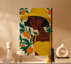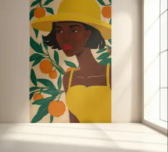 Un ritratto sorprendente di una donna di colore con un cappello da sole giallo brillante, circondata da arance. Il suo sguardo diretto e sicuro e i colori vivaci creano un'immagine potente, bella e solare.