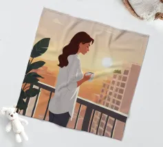 Una serena scena minimalista di una donna in piedi sul suo balcone, con in mano una bevanda calda mentre il sole sorge sulla città. Questa opera d'arte celebra la consapevolezza, la gratitudine e la tranquilla bellezza dei nuovi inizi.