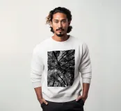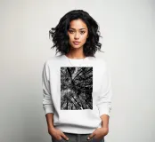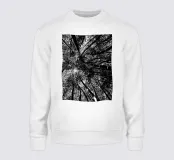 Vista in bianco e nero dal basso di una foresta di alberi molto alti.