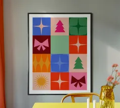 Aggiungete un tocco di fascino giocoso al vostro arredamento natalizio con questa colorata illustrazione astratta dell'albero di Natale. Realizzato con audaci forme grafiche ritagliate in un allegro arcobaleno di colori pastello (rosa, giallo, arancione, verde e sormontato da una sorprendente stella nera), questo disegno dà un tocco moderno alle tradizionali icone natalizie. Su uno sfondo rosa tenue, crea un'atmosfera femminile e festosa, fresca ed elegante. Perfetta per l'arte murale, i cuscini, le decorazioni per la casa e per i regali di Natale, questa illustrazione illuminerà sicuramente la vostra stagione natalizia con la sua estetica unica e gioiosa.