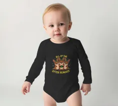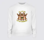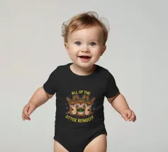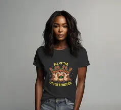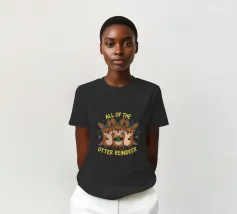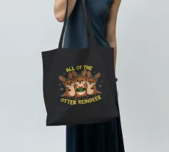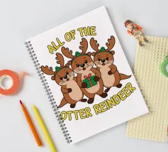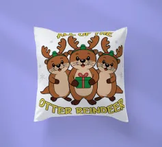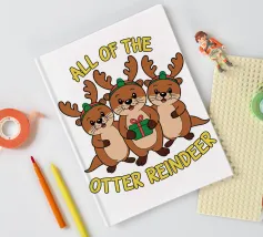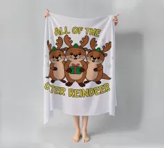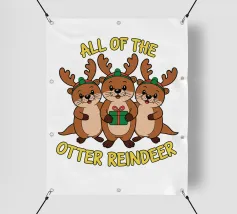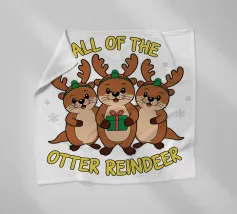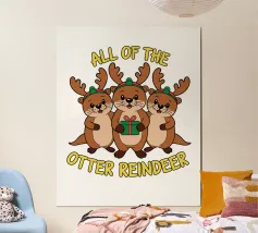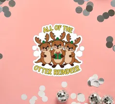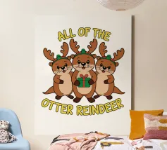 Tre lontre con corna da renna sono allegramente in piedi insieme, ognuna con un abbigliamento festivo e una con un regalo in mano. I fiocchi di neve li circondano, rendendo il tema natalizio ancora più interessante, e le parole "All of the Otter Reindeer" appaiono sopra e sotto.