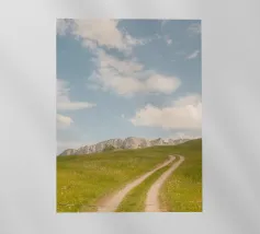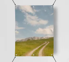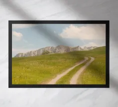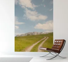 Un tortuoso sentiero sterrato si snoda attraverso un prato alpino di un verde intenso, punteggiato di fiori selvatici, e conduce verso drammatiche scogliere calcaree sotto un tenue cielo nuvoloso. Questo sereno sentiero di montagna cattura la bellezza pacifica dei paesaggi escursionistici svizzeri e il fascino senza tempo dei sentieri rurali di montagna. Perfetto per portare un senso di avventura e tranquillità naturale in qualsiasi spazio.
