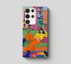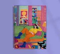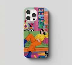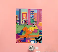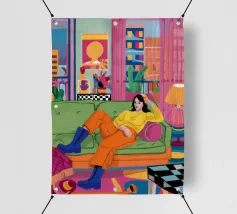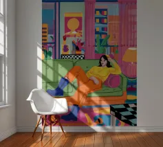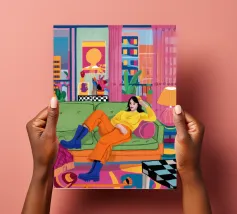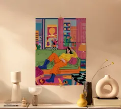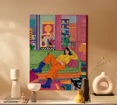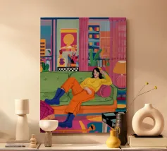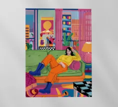 Illustrazione di tre amici diversi che si rilassano e chiacchierano su un divano colorato in una stanza arredata con stile. La scena è una celebrazione calda, vibrante e gioiosa dell'amicizia e della vita moderna.