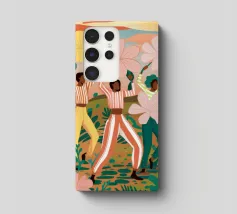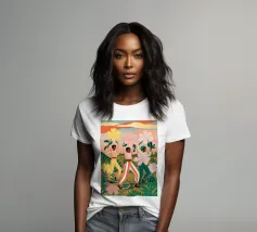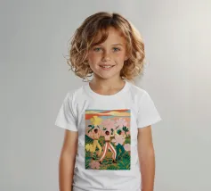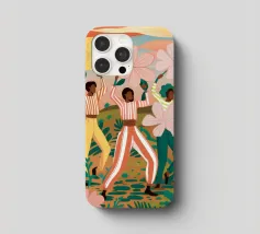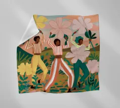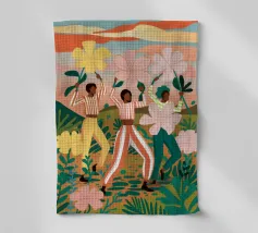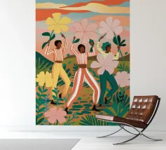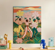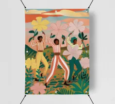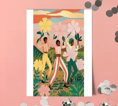 Un'illustrazione che scalda il cuore mostra un gruppo eterogeneo di amici che camminano insieme, tenendo in mano fiori giganti, che simboleggiano l'amicizia, l'unità e la gioia condivisa in piena fioritura.