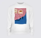 Illustrazione grafica e minimalista di una tazza di caffè su un piattino, appoggiata sul bordo di un tavolo con una tovaglia a scacchi rossi e bianchi.