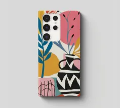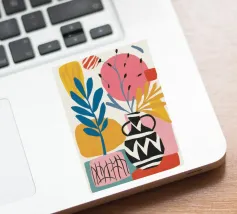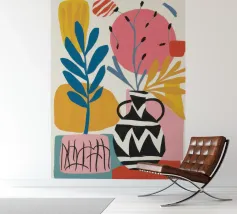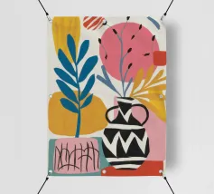 Un'illustrazione elegante di un accogliente angolo di stanza pieno di piante d'appartamento in vari vasi decorativi. La composizione e la tavolozza dei colori hanno un'atmosfera moderna e bohémien, che celebra la tendenza della "giungla urbana".