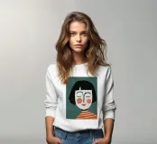 Un ritratto dolce e sereno di una donna con capelli neri corti, guance rosee e occhi chiusi. Il suo top a righe e lo sfondo semplice e strutturato creano una sensazione di quieta contemplazione e pace interiore.