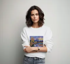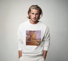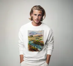 Un sereno paesaggio autunnale che raffigura un fiume che scorre dolcemente attraverso una campagna di alberi ornati da fogliame autunnale dorato e arancione, sotto un cielo morbido e vaporoso. Lo stile dell'acquerello esalta la qualità tranquilla e pittoresca della scena.