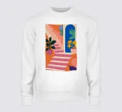 Una scena architettonica stilizzata con una scala rosa e arancione che sale oltre un arco blu. Piante verdi e rigogliose con foglie sporgenti incorniciano la composizione, evocando una forte atmosfera mediterranea o da oasi nel deserto.