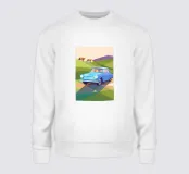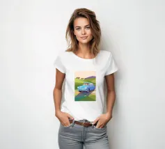 Illustrazione di un'auto d'epoca blu che guida in campagna con uno sfondo di case e colline in stile geometrico moderno.