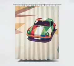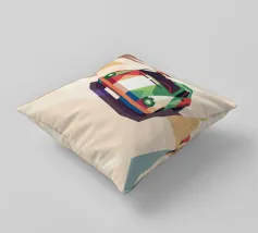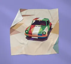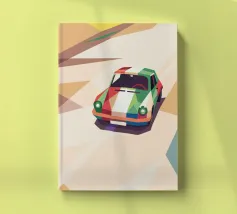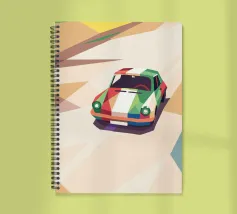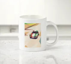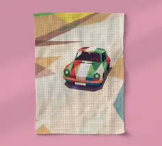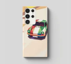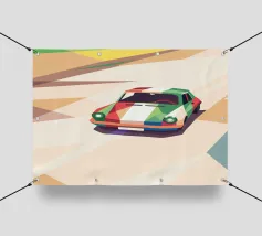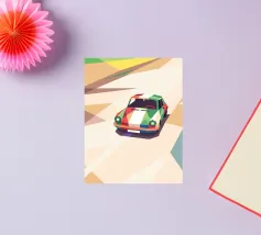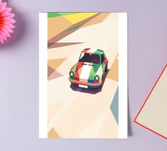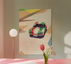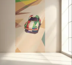 Illustrazione di un'auto da corsa con una combinazione di colori unica sulla strada con uno stile geometrico moderno.