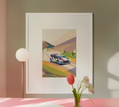 Illustrazione di un autoscontro colorato in un'arena di gioco con uno stile geometrico moderno.