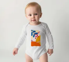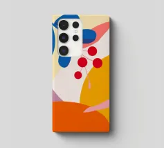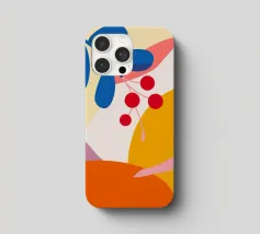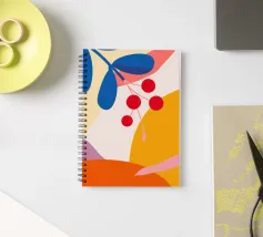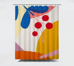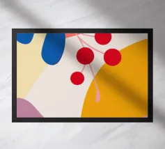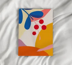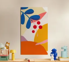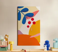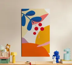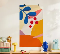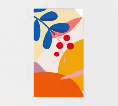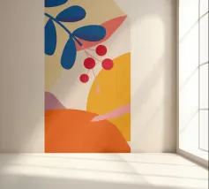 Composizione astratta moderna ed elegante con foglie stilizzate e un ramo con bacche rosse. La tavolozza di colori caldi e autunnali e le forme pulite creano un pezzo sofisticato ed equilibrato.