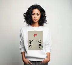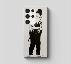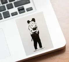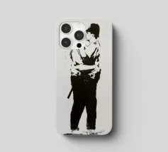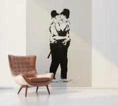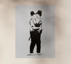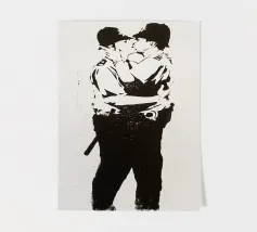 Questo audace stencil di Banksy raffigura due agenti di polizia in uniforme completa che si baciano appassionatamente. L'opera è una dichiarazione potente, umoristica e provocatoria che sfida la percezione pubblica e i tabù sociali. Utilizza l'amore e l'intimità per affrontare la rigidità istituzionale e i pregiudizi.