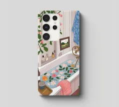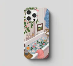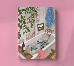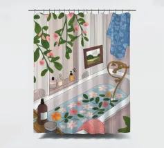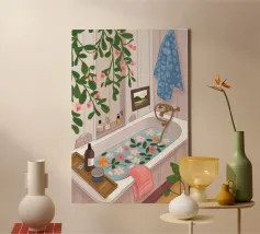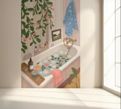 Una vasca da bagno con acqua e petali di fiori è circondata da piante sospese e scaffali di legno pieni di prodotti da bagno, creando un'oasi di relax naturale.