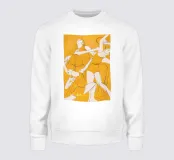 Un'opera d'arte astratta di figure femminili danzanti delineate in nero su uno sfondo giallo vibrante, che esprime ritmo e movimento in uno stile minimalista.