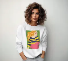 Illustrazione moderna in stile mod, audace, luminosa e colorata di una bambina grande con un maglione a righe