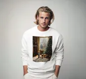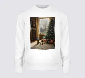 Un delizioso motivo natalizio: un bambino si trova stupito di fronte all'albero di Natale decorato, circondato da regali colorati e luci scintillanti. La delicata luce invernale entra nella stanza attraverso la grande finestra, creando un'atmosfera piena di calore, sicurezza e attesa. Un'immagine senza tempo di gioia infantile e magia natalizia.