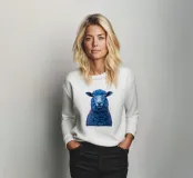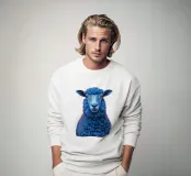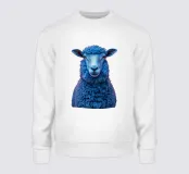 Un'immagine sorprendente di una pecora blu surreale con lana strutturata, che si staglia su uno sfondo rosa brillante. L'audace contrasto cromatico e la composizione minimalista creano un'estetica giocosa e moderna.