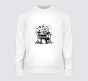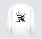 Illustrazione di uno scheletro percussionista che suona una batteria, in una tavolozza nera e grigia con accenti bianchi. Uno stile scuro e diretto, ideale per magliette rock e goth e abbigliamento dark.
