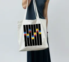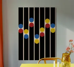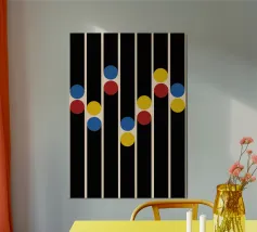 Una sorprendente composizione di ispirazione Bauhaus con audaci punti blu, gialli e rossi abbinati a sottili linee verticali che si estendono come ombre delicate. L'estetica pulita della metà del secolo scorso fonde la giocosità retrò con la geometria elegante, rendendola una dichiarazione senza tempo per gli amanti del design.