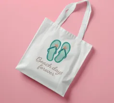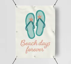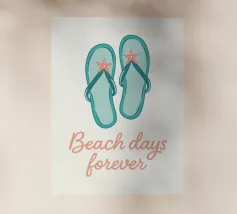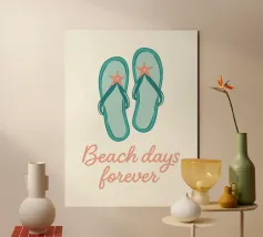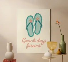 Lasciate che l'energia rilassata dell'estate viva con questa giocosa stampa di infradito. Con sandali a forma di stella marina disegnati a mano e una scritta "Beach days forever", questo disegno conferisce un fascino costiero a qualsiasi spazio. Perfetto per l'arredamento di dormitori, camere di ragazzi o per chiunque desideri un po' di sole in casa.