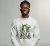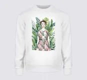 Avvolta da motivi floreali, una figura si erge con grazia tra la vegetazione lussureggiante. Foglie vibranti e petali rigogliosi incorniciano la loro silhouette, formando un ipnotico tableau naturale.