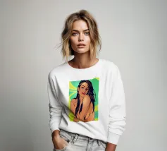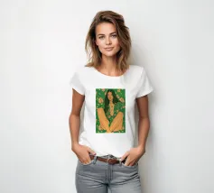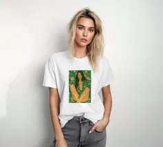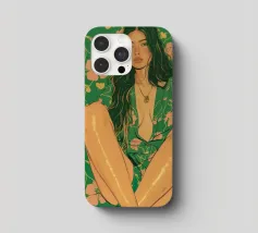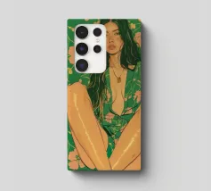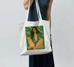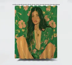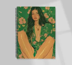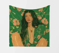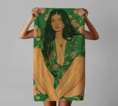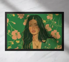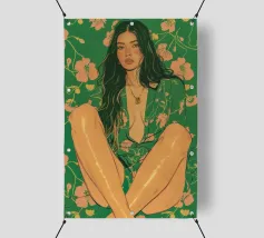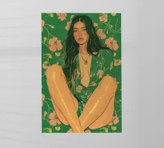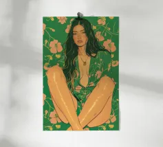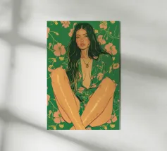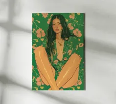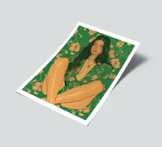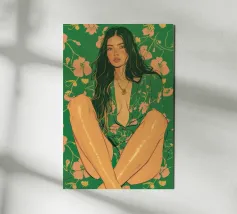 Questa opera d'arte figurativa da parete raffigura una giovane donna elegante in kimono verde e pantaloni a fiori, seduta in una posa elegante. Il disegno minimalista e la vivace palette di colori verde, arancione e beige conferiscono all'opera un tocco moderno e scandinavo. Ideale per un arredamento sofisticato!