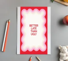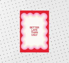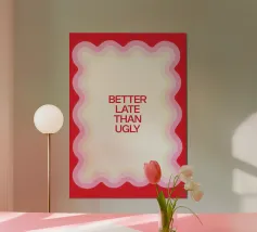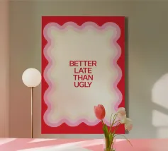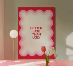 Una frase sfacciata con un umorismo senza tempo: Better Late Than Ugly (meglio tardi che male). Perfetto per il bagno, la zona spogliatoio o l'angolo della toilette, questo design unisce una tipografia moderna a uno spirito spensierato, ricordandoci di prenderci il nostro tempo e di farci una risata.
