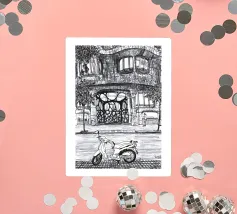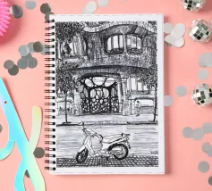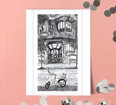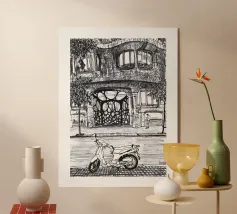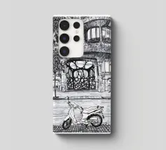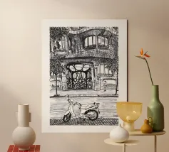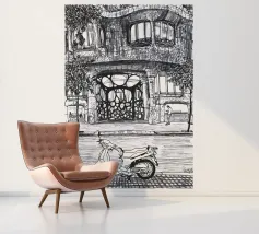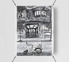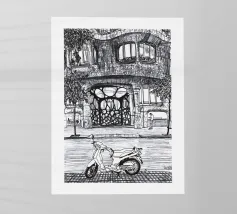 La Pedrera, progettata da Antoni Gaudí. Il cancello sembra collegare il grembo materno al mondo esterno. Nel mondo esterno è parcheggiata una motocicletta. Con questa si può andare ovunque.